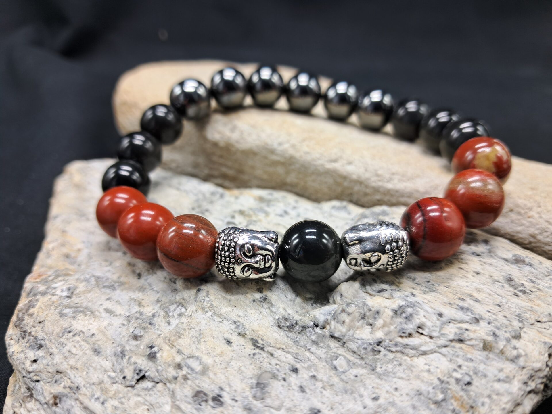 Bracelet jaspe rouge, obsidienne noire, hématite 10mm